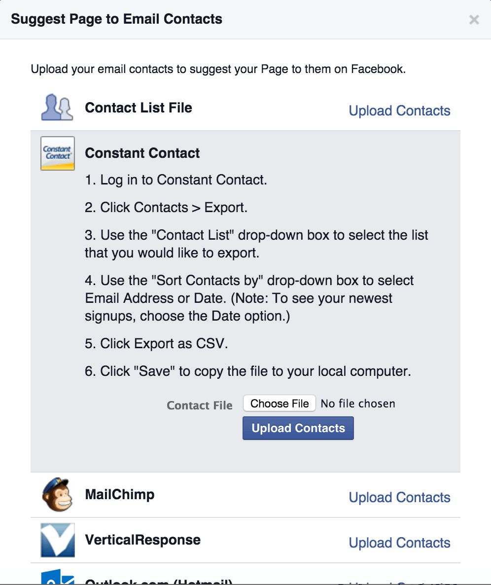 3. For example: If you use Constant Contact, you select that option and it will supply you with directions on how to export the list through their software, and upload the file into Facebook.