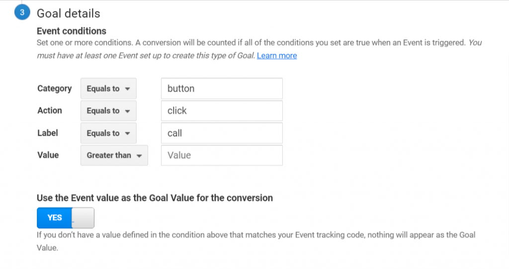 The first in setting up conversion tracking on your website is to login to Google Analytics. Once logged in, go under the “Admin” tab on the left side of your screen. Next, click “Goals”, which you’ll see on the right side of your screen under the “View” column. Now click the red “New Goal” button, then select “Custom” underneath “Goal Setup”. Click “Continue”, then name your goal something relevant to the conversion that you want to track. In this article, we’ll set up a click-to-call goal as an example. Next, under “Type”, select “Event”. Now, under the “Goal details” section, type in “button” in the Category section, “click” in the Action section, and “call” in the Label section. This section can be tricky because you’ll need these 3 words again in Google Tag Manager, so make sure that there are no spelling errors and you’ve typed them in all lowercase characters. For a visual example of how this should look, see the image below.