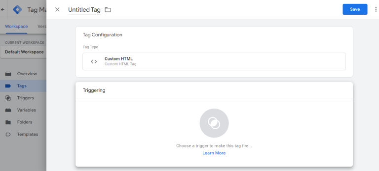 - Next, under “Tag Configuration”, select “Custom HTML”, then paste in the schema markup you created during the last step.