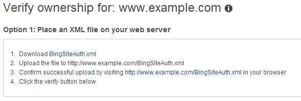 The first is to add an XML file to your web server. To do this download the XML file and upload it to your roof folder via FTP. Once the file has been uploaded, go to https://www.example.com/BingSiteAuth.xml to test that the file is working. If it was successful, click “Verify” at the bottom of the page.