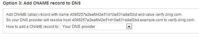 Adding a CNAME record is different for every DNS provider. Bing provides an option to select your DNS server and then searches for instructions on how to add the CNAME record. Choose your DNS provider and follow the instructions. Once you have added the CNAME, click “Verify” at the bottom of the page.