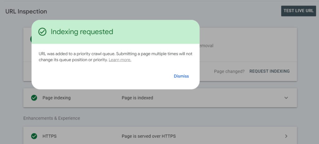 Another great way to improve your website’s SEO using Google Search Console is by submitting your new pages and posts for faster crawling and indexing. Although Googlebot, Google’s web crawler software, discovers new pages relatively quickly, you can speed up this process and make your pages eligible to be found in the search results more quickly by submitting them for crawling and indexing as soon as they’ve been published. To do this, simply paste the new page’s URL into the search bar at the top of the Google Search Console window and click enter. Next, click the “Request Indexing” button on the right side of the page and wait for the green message to pop up that says “Indexing requested”.