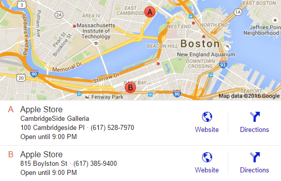 The above results came up after simply searching “Apple Store”. Local listings make it easy for web users to see the locations of multiple businesses and map out how to get there. It also directs users to the website in case they need more information. For mobile users, the very same search query would appear like this:
