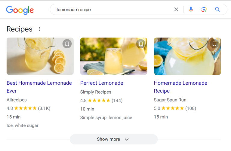 Before you add schema markup to your website, it’s important to understand what exactly it is and what it does. Schema markup is a “structured data vocabulary” that communicates elements of a webpage to all major search engines, allowing them to better understand the content on that page, and therefore, better represent that page’s content in the search results. Adding schema markup to your webpages will allow them to appear in the “rich results” sections of search engine results pages, which are the sections on a SERP that have extra visual or interactive features. For instance, if you Google “lemonade recipe”, you’ll see three recipe articles that appear near the top of the search engine results page with images, ratings on a five star scale, the time it takes to complete the recipe, and the ingredients needed to make the recipe. The reason that these webpages are eligible to appear in this “rich results” section of the SERP is because they include recipe schema.